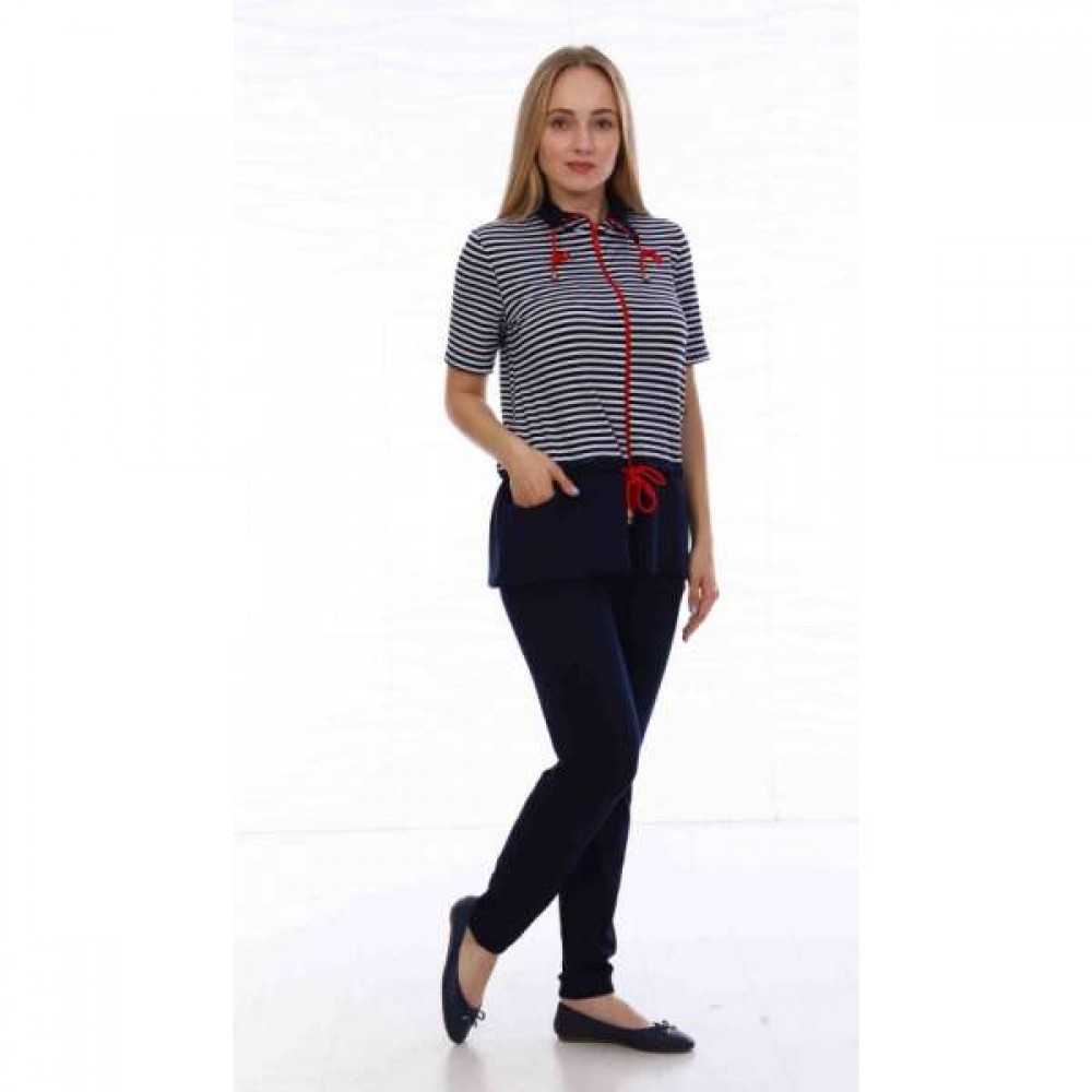 Цвет: представлено в одной расцветке В комплект костюма входит: блуза и брюки. Блуза с центральной застёжкой на молнию, небольшой втачной рукав, горловина стойкой и присобирается на кулиску. На изделии присутствуют два кармана по бокам. Линию талии подчёркивает кулиска. Брюки прямые, на широкой резинке, небольшой манжет.