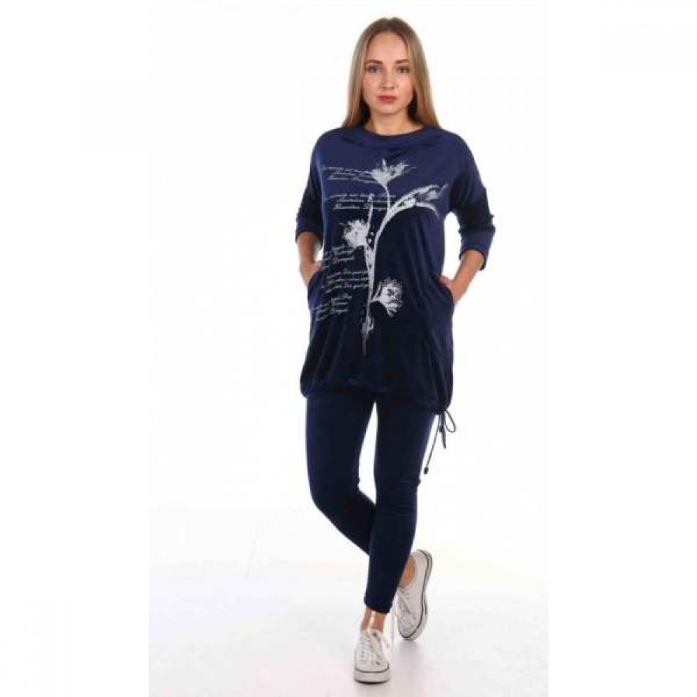 Цвет: представлено в одной расцветке Костюм состоит из блузки и лосин. Блузка удлинённая, рукав 3\4, два кармана по бокам, низ изделия собирается на кулиску. Лосины на резинке. На полочке изделия выполнен принт в технике "шелкография".
