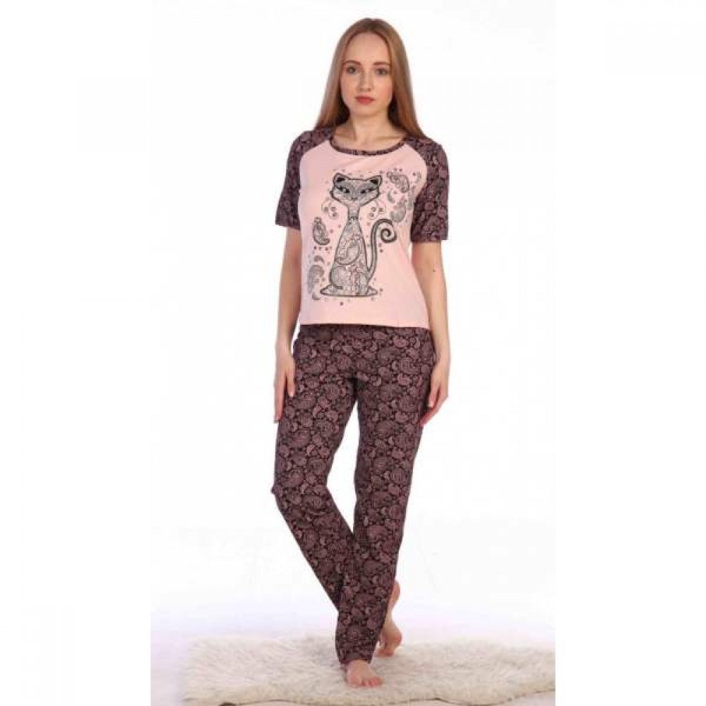 Цвет: представлено в одной расцветке Костюм состоит из футболки и брюк. Футболка полуприлегающего силуэта, горловина круглая, рукав реглан длиной до локтя, вставки из контрастной ткани. На полочке изделия выполнен принт. Брюки прямые на резинке.
