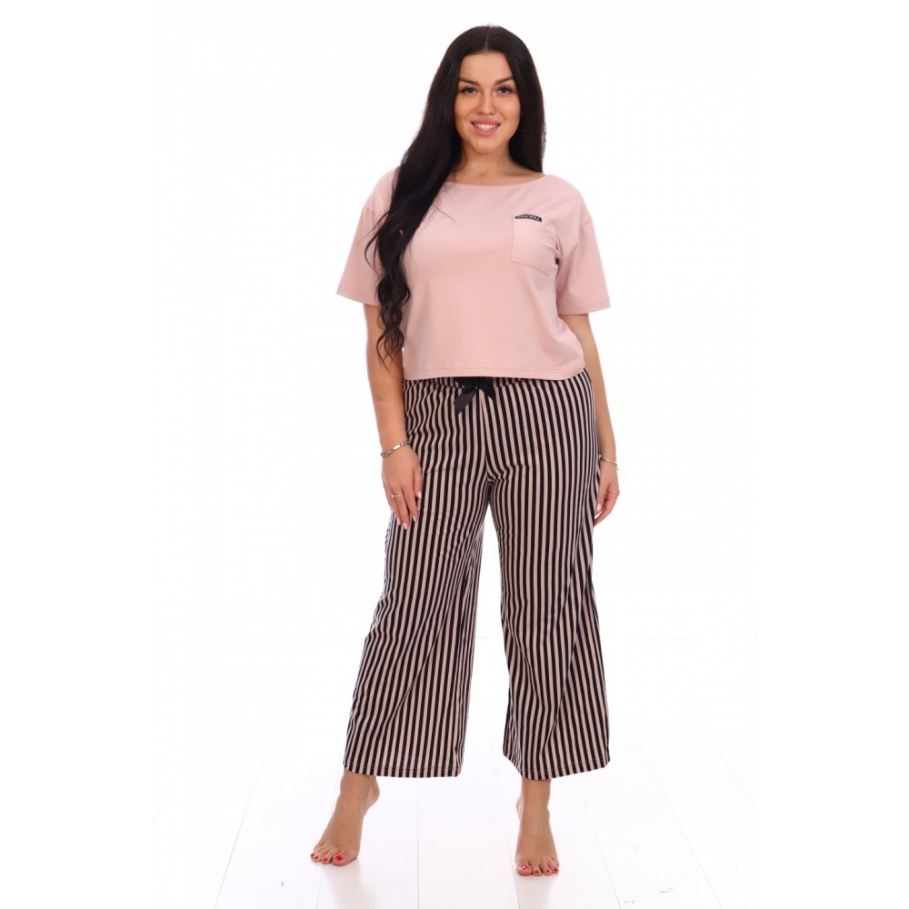 Костюм домашний состоит из футболки оверсайз с карманом на груди и кюлот на широком поясе с резинкой, украшеном атласным бантом.Состав 100% хлопок