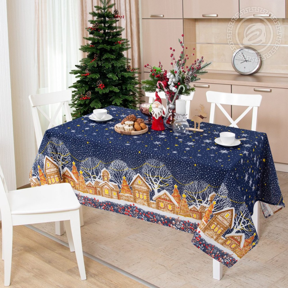 На новогодней скатерти из рогожки изображена великолепная улица, словно из старых добрых сказок. Избы с резными ставнями, ёлочки с шариками и звездами, красивые снежинки, парящие в ночной мгле, - волшебный дизайн создает атмосферу уюта, тепла и ощущение праздника.