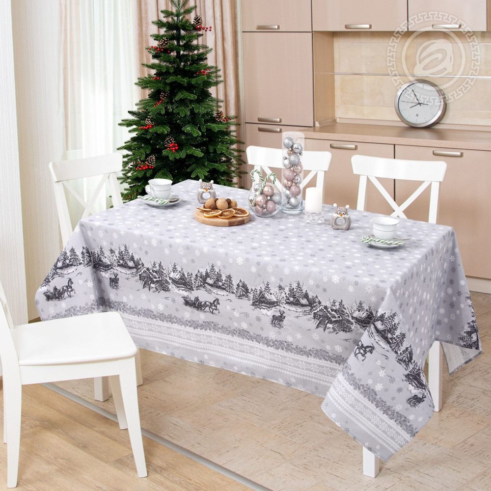 «Сочельник скатерть» – настоящая зимняя сказка на рогожке. Завораживающие и волшебные пейзажи с деревенскими избами и заснеженными елями будто нарисованы грифельным карандашом на сером холсте. Смотришь на самобытный рисунок и вспоминаются строки Александра Пушкина о красоте русского пейзажа. Простая и в то же время изящная рождественская композиция сделает праздник уютным и по-семейному теплым.