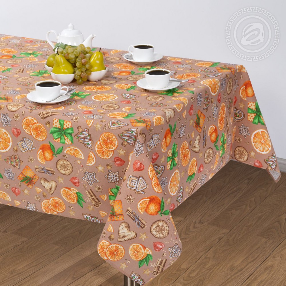 Скатерть «Цитрус бежевый» из рогожки собственного производства – чудесный подарок на Новый год. Кухонные изделия украсил стильный рисунок с праздничными атрибутами: пряниками, фруктами и гостинцами. Детали выглядят настолько натуралистично, что кажется, будто в воздухе витает неповторимый аромат корицы и мандаринов, а на под ёлкой дожидаются подарки в красивых обертках и вкусные пряничные домики. Это приятный сюрприз для каждой хозяйки.