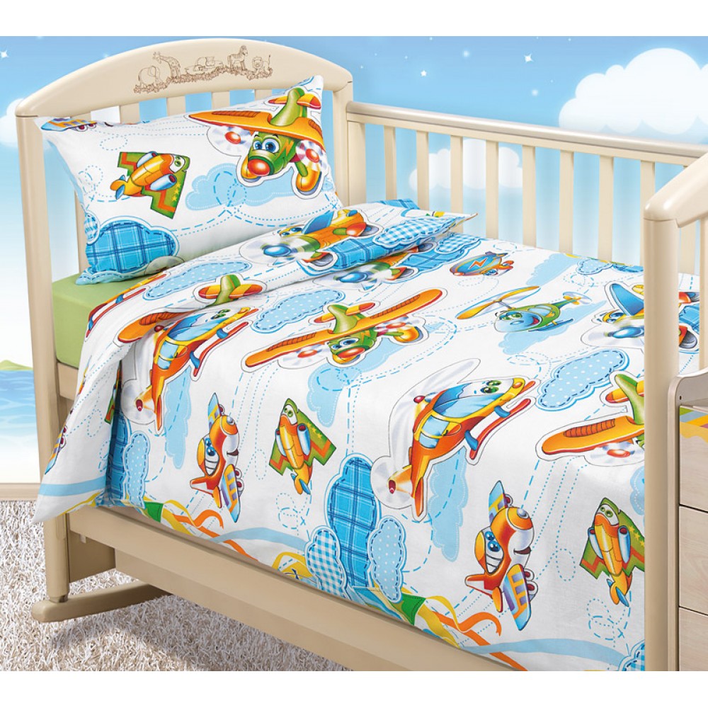 Забавные вертолеты и самолетики станут превосходной компанией малышам, любящим активные и шумные игры. Разноцветные винтокрылые машины, выполненные в мультяшной стилистике, размещены на белом фоне с синими облачками, который по краям полотна переходит в полосато-синий. Элементы декора словно "нашиты" на ткань в формате заплаток, напоминая о популярной технике пэчворк.