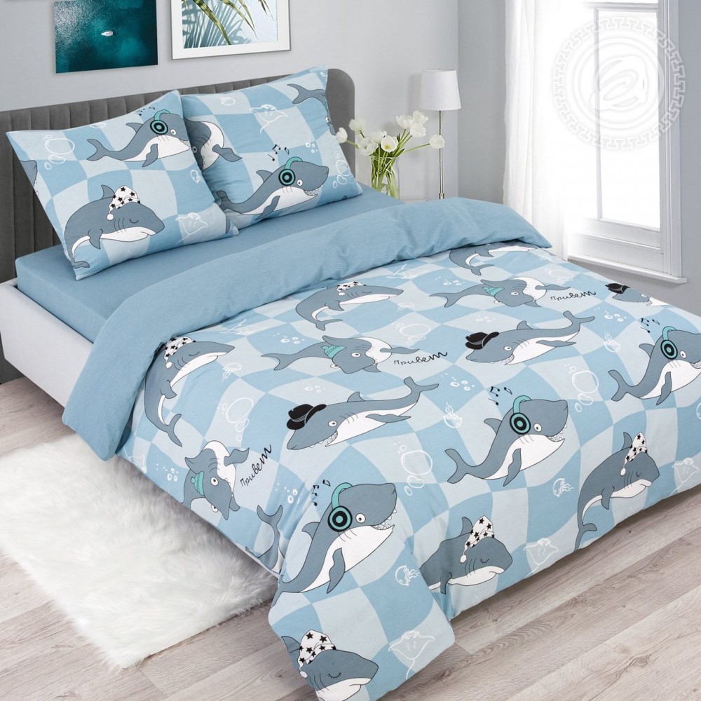 «Гавань» – хит нашей коллекции! Постельное белье с акулами из бязи понравится и детям, и подросткам, и взрослым. Это актуальный принт на все времена и все сезоны. Он сочетает тренды и вызывает эмоции. На рисунке очаровательные акулы, которые притягивают взгляды. Среди наших героев модники, меломаны и сони. Все они забавные и очень милые. А дополняет принт узор в морской палитре.
