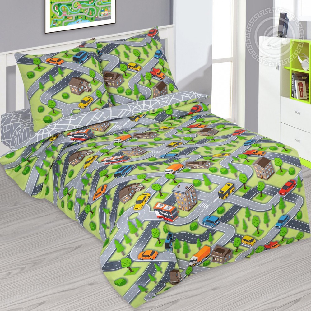 «Автодром» – оригинальный подарок для маленьких путешественников. На постельном белье яркий и необычный рисунок с машинками. Среди домиков и деревьев, по дорогам, мчатся легковые автомобили, автобусы, грузовики. Все машинки разноцветные: синие, красные, оранжевые, желтые. Летний пейзаж дополняет красочный принт.