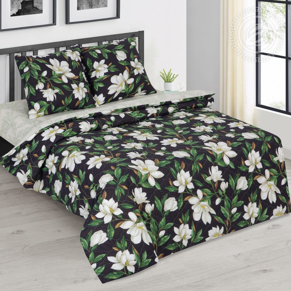Модный принт с белыми магнолиями украсил постельное белье «Фелиция». Белоснежные лепестки красивых цветов контрастируют с фоном в темной палитре. Композиция представляет собой гармоничное сплетение трендовых оттенков и элегантного рисунка, символизирующего женскую красоту и изящество.