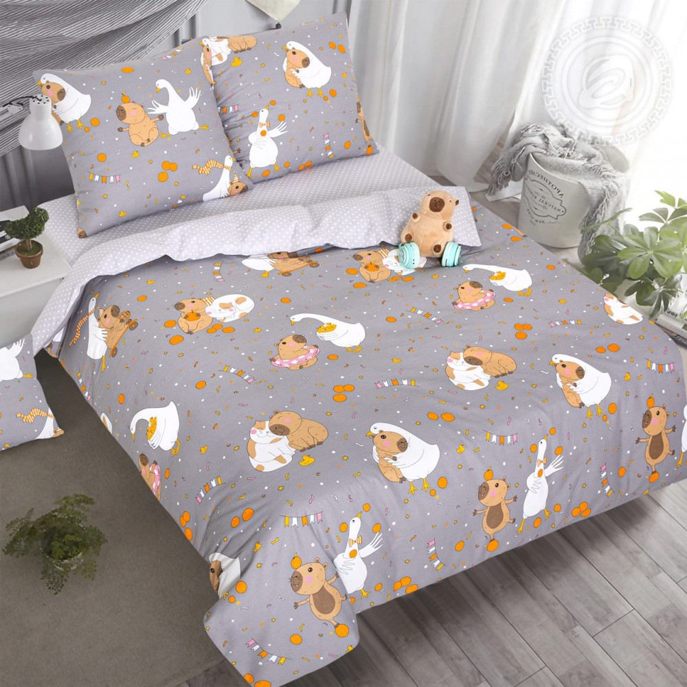 Постельное белье с капибарой, гусями и котятами из поплина – настоящая находка для создания уютного уголка. Забавные и симпатичные герои, экологичные и гипоаллергенные материалы, нежные оттенки – комплект из 100% хлопка подарит каждому ребенку чудесные сны и пригласит мальчишек и девчонок в мир сказки.