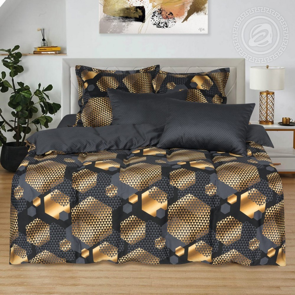 Постельное белье из сатина в черно-золотых тонах «Альберт» — это премиум-подарок для Вашей спальни. Комбинация контрастов поражает воображение и символизирует богатство. Насыщенные черные оттенки с геометрическим узором в виде золотистых гексагонов создают роскошный образ, который выглядит элегантно и дерзко одновременно. «Альберт» — шикарный выбор царских особ.