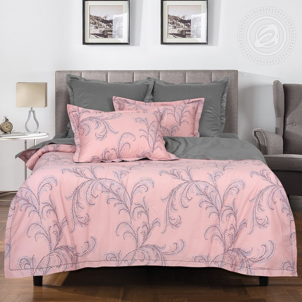 «Жюли» - женственный и элегантный комплект из премиума ткани – мако-сатин. Он выполнен в модной гамме и украшен растительными мотивами.