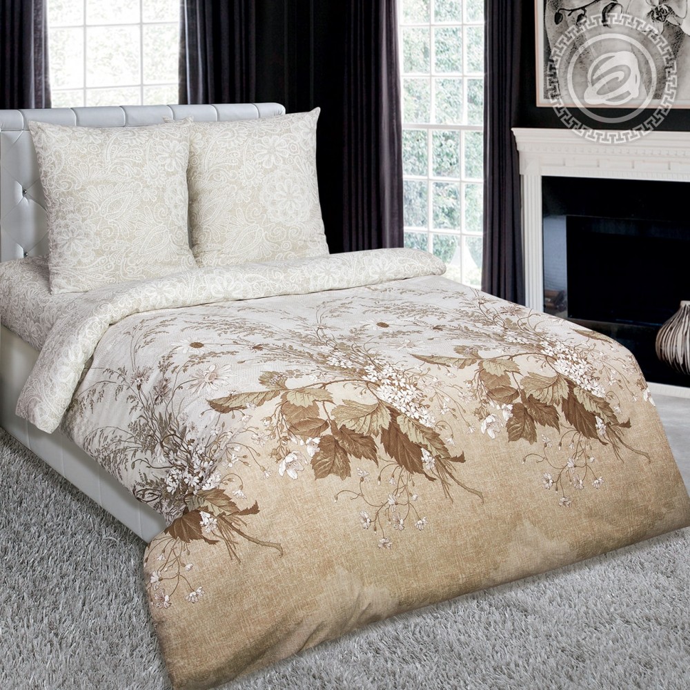 Фон рисунка «Адажио» решен через модный сейчас прием «омбре» - плавный переход от светлого пастельного оттенка к более темному бежево-коричневому. Вся пастельная часть кажется вытканной орнаментом, напоминающим ажурное кружево цвета слоновой кости. В более темной части рисунку придана фактура природного материала. На первом плане в оттенках белого, шоколадного, бежевого и коричневого изображены собранные с легкой намеренной небрежностью букеты полевых цветов и крупных листьев.