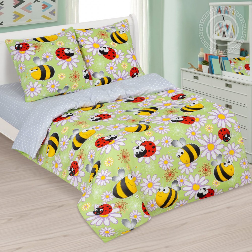Сказочная полянка, усыпанная ромашками и залитая солнечным светом, жужжащие шмели и милые божьи коровки, - яркий и неповторимый рисунок украсил детское постельное белье из бязи. Это практичный и гипоаллергенный комплект из 100% хлопка с оригинальным дизайном и очаровательными героями, которые создают летнее настроение.