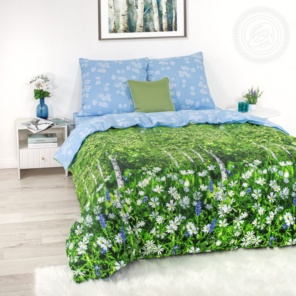 Любите ли вы гулять по лесу? Наслаждаться умиротворением и тишиной, прислушиваться к трелям птиц и любоваться красотой деревьев? С нашим постельным бельем с природой делать это можно, даже не выходя из дома. Ведь здесь изображена летняя сказочная композиция с березовой рощей, охапкой ромашек и голубым небом. Белая береза и нежная ромашка – символы нашего фольклора. Они тесно связаны с культурой, сказками, стихами.