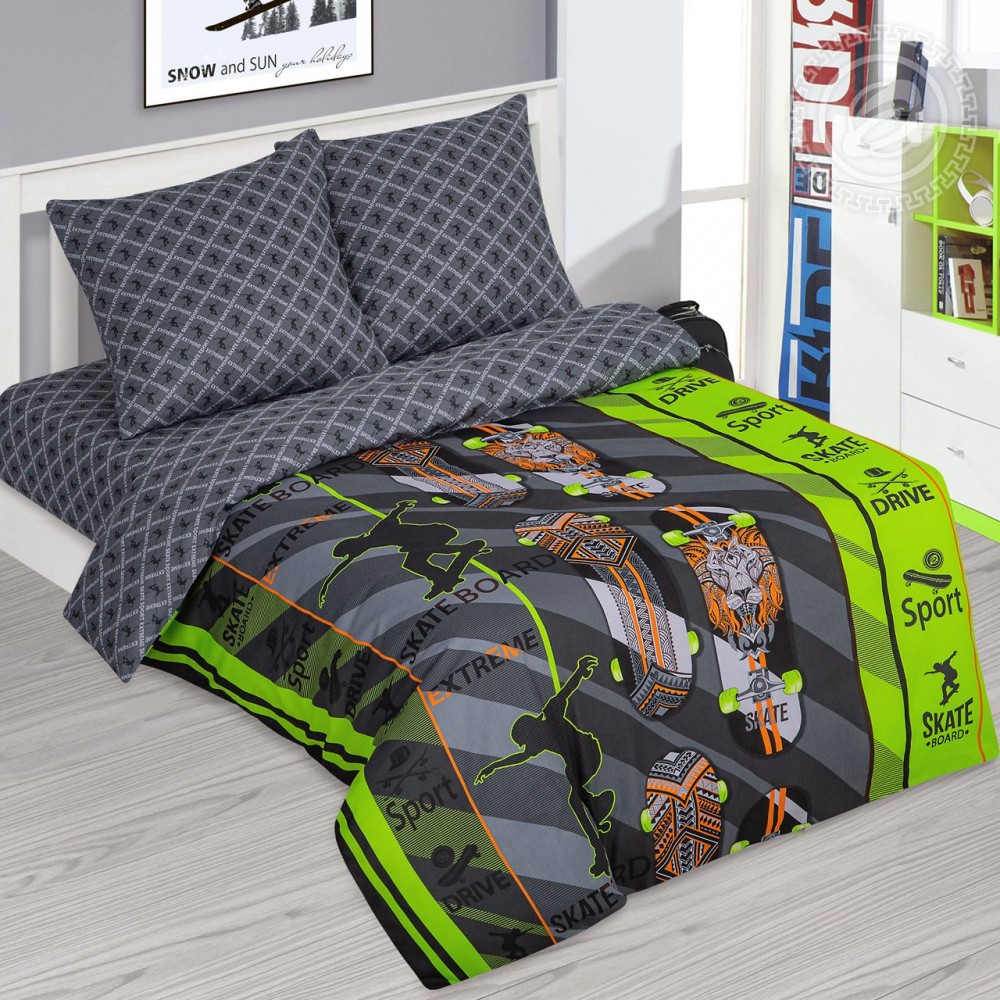 «Флип» – комплект постельного белья бязь с эксклюзивным дизайном в виде ярких скейтбордов. На хлопковой ткани модные оттенки и детали с огненными львами и силуэтами спортсменов, выполняющих эффектные трюки. Современный дизайн займет достойное место в спальне и станет любимым в коллекции юных чемпионов.