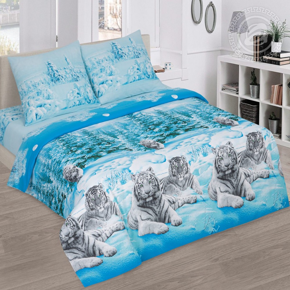 Настоящая удача встретить в природе тигра с таким окрасом, как на данном комплекте. Но вы можете поселить его у себя в спальне, чтобы он охранял ваш сон. Приятные «зимние» цвета несут в себе освежающие нотки, а плотная и прочная бязь сделает отдых комфортным.
