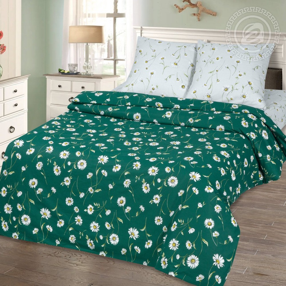 Белоснежные подушки и простынь – мягкое облако, покрытое нежными ромашками. Пододеяльник – летний, зеленый ромашковый луг. Комплект постельного белья из бязи «Милора», с трогательным ромашковым принтом, окутает атмосферой тепла и комфорта, впишется в любой интерьер и придется по сердцу романтичным натурам.