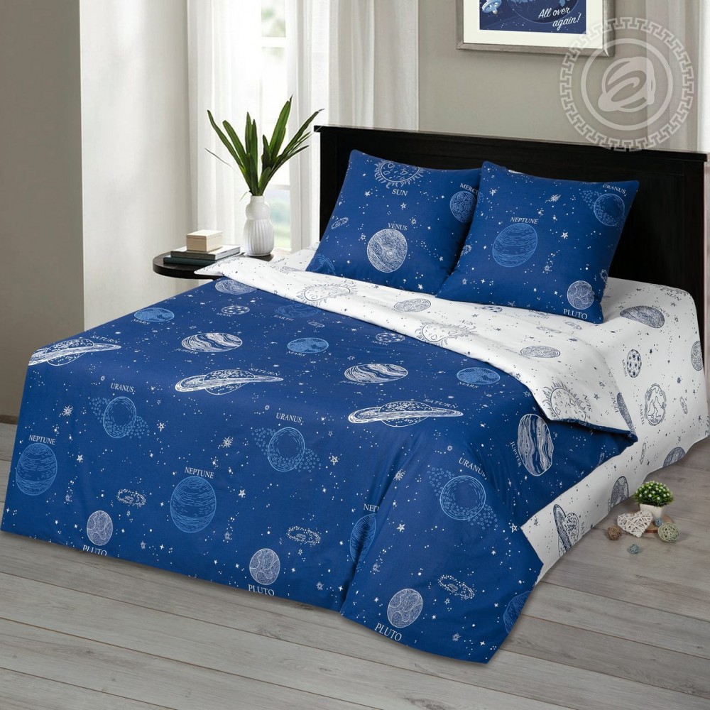Постельное белье «Гравитация» из бязи с тематическим дизайном отражает красоту и загадочность космоса. На рисунке изображены планеты, Солнце и Луна. Каждая планета имеет свою надпись и находится в окружении бесчисленных звезд, сияющих на темно-синем небосводе.