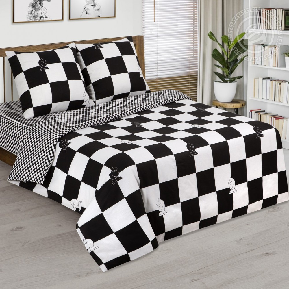 Если вы любите шахматы, то комплект из бязи «Партия» вам точно понравится. Фон постельного белья представляет собой классическое шахматное поле, на котором застыли знакомые фигуры. Дизайн – настоящая магия контрастов с великолепным сочетанием черного и белого цветов. Комплект смотрится атмосферно и стильно.