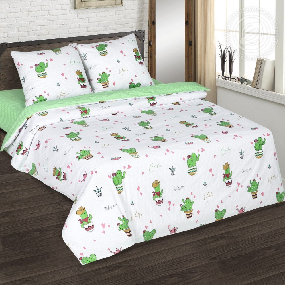 Кактусы – популярный принт в постельное белье последних лет. Зеленые колючки собрали миллионы поклонников по всему миру и продолжают завоевывать сердца. Комплект из поплина «Мехико» понравится и детям, и взрослым. На рисунке забавные и веселые кактусы в ковбойских шляпах и влюбленные парочки в цветных горшочках. Яркий дизайн принесет фейерверк эмоций и сказочные сны.